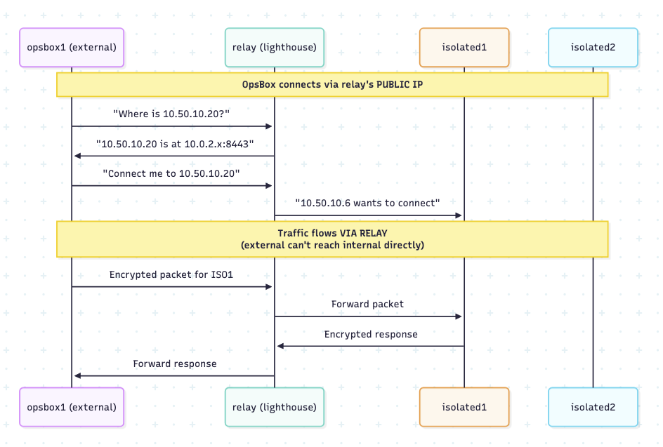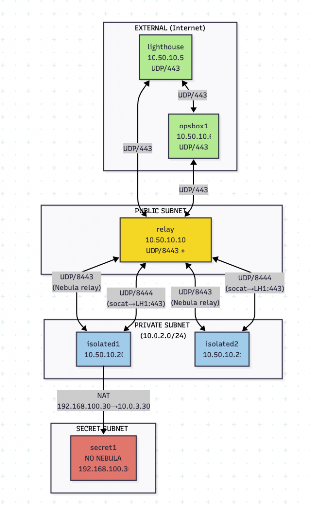 The only issue with this setup (more of a Nebula restriction) is that the relayVM (which acts as the pivot point to isolated1 and isolated2, requires a socat pipe to tunnel UDP Nebula traffic back to the external Lighthouse due to them being in a private, non-routable subnet and not being able to bind to low ports. The relayVM does not run as root, representing a compromised machine where you have user-land access (such as a laptop or jump server) but not SYSTEM or root.