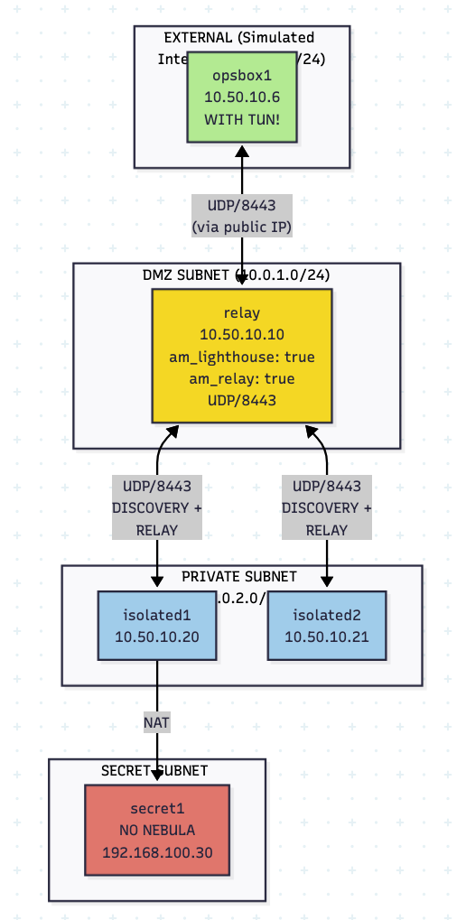 If you check the Ansible that deploys and configures all the VMs, you can see that secret1 does not have Nebula installed and thus is not part of the mesh. It is actually on a 192.168.x.x IP address. You are able to use Nebula with the unsafe_routes argument to allow machines to egress from Nebula into unmanaged or uncompromised subnets.