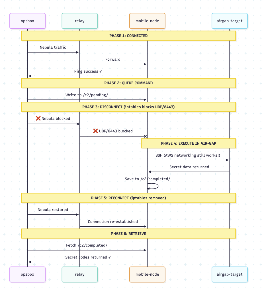 iptables -A OUTPUT -p udp --dport 8443 -j DROP - EXECUTE: Mobile-node SSHs to airgap-target, runs
