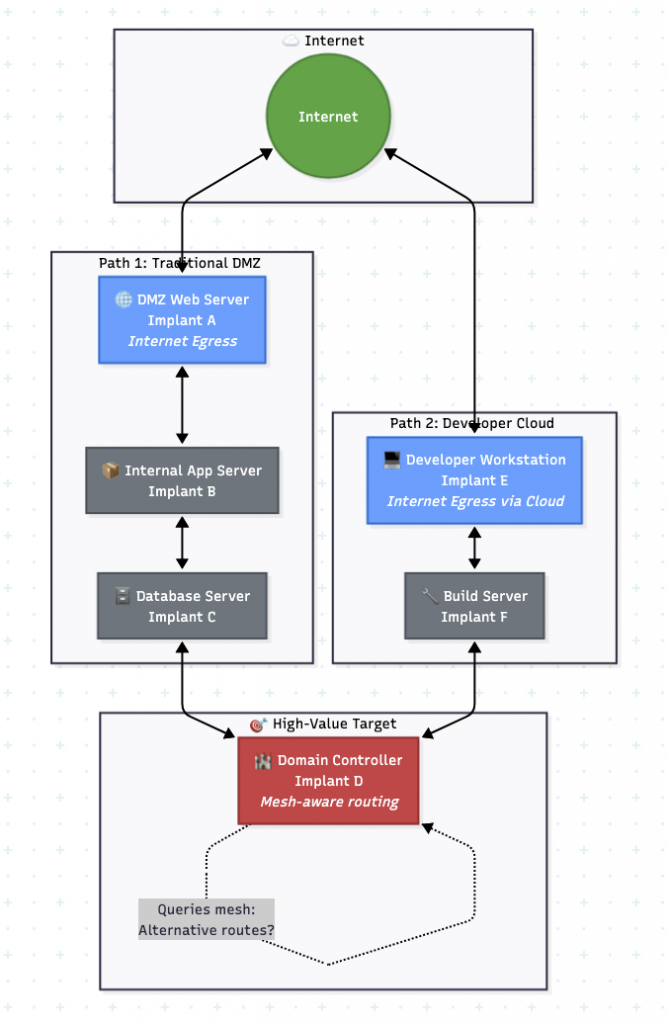 In a mesh-aware model, Implant D on the domain controller knows that it can reach the internet through Implant A (via B and C) or through Implant E (via F, if reachable). If A becomes unavailable, D can query its routing table, determine that E offers an alternative path, and establish connectivity through that route.